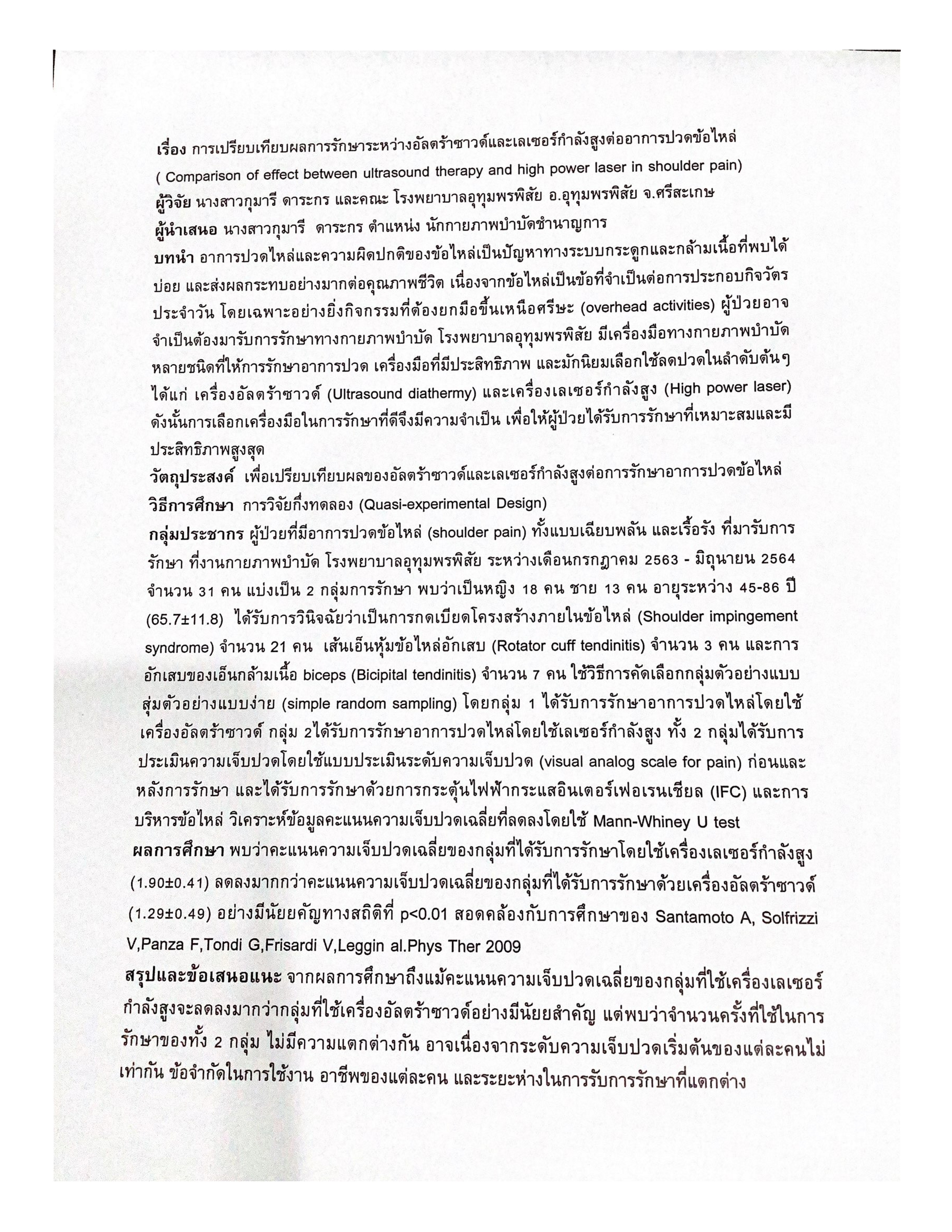 Eknarin สร้างหัวข้อกระทู้: [ 2565 ] : การเปรียบเทียบผลการรักษาระหว่างอัลตร้าซาวด์และเลเซอร์กำลังสูงต่ออาการปวดข้อไหล่