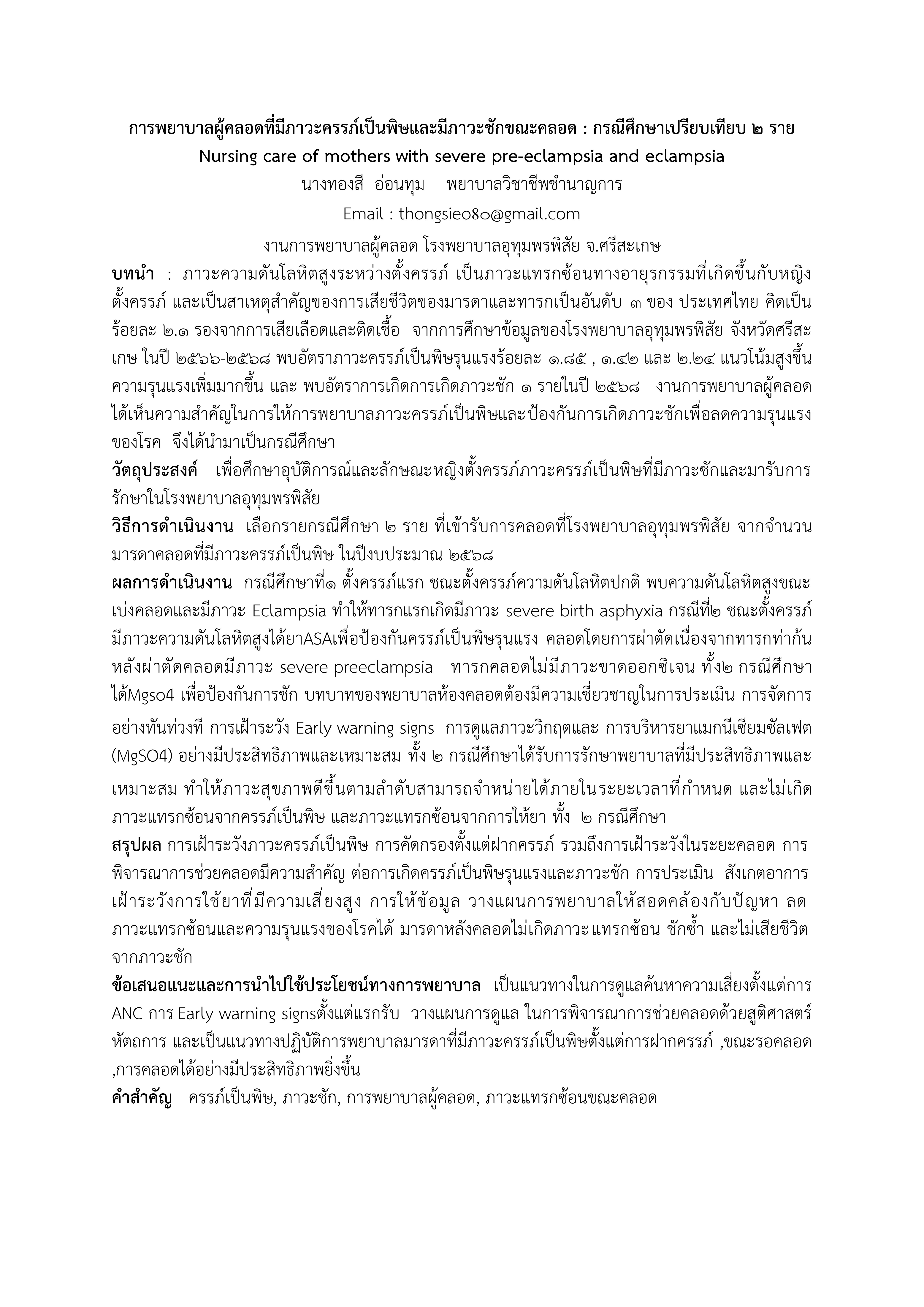 Eknarin สร้างหัวข้อกระทู้: [ 2568 ] : การพยาบาลผู้คลอดที่มีภาวะครรภ์เป็นพิษและมีภาวะชักขณะคลอด